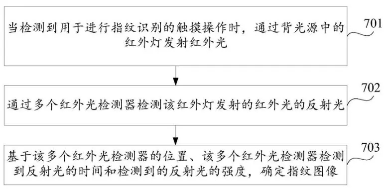 最后,根據(jù)多個紅外光檢測器的位置、多個紅外光檢測器檢測到反射光的時間和檢測到的反射光的強(qiáng)度,確定指紋圖像。